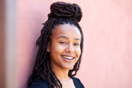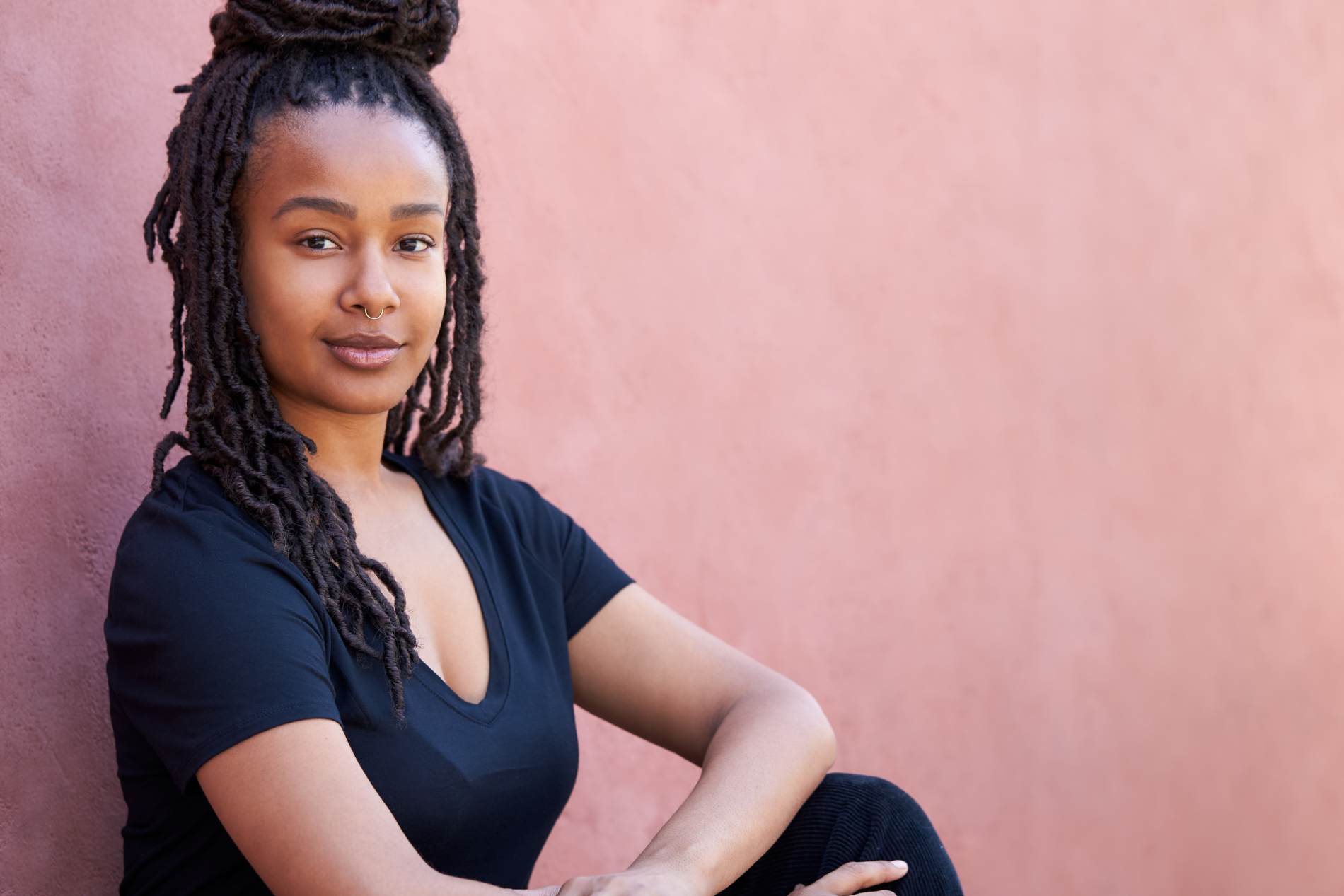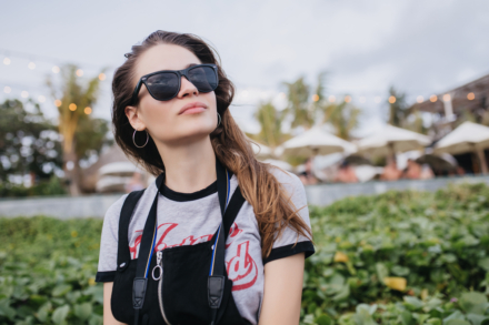 Winsome girl in black sunglasses looking at sky on nature background. Outdoor shot of fashionable brunette woman spending time outdoor in evening.Photo by Blahdownload original